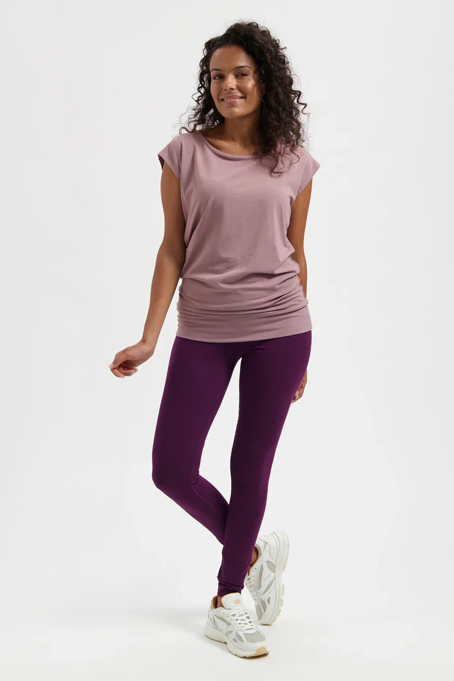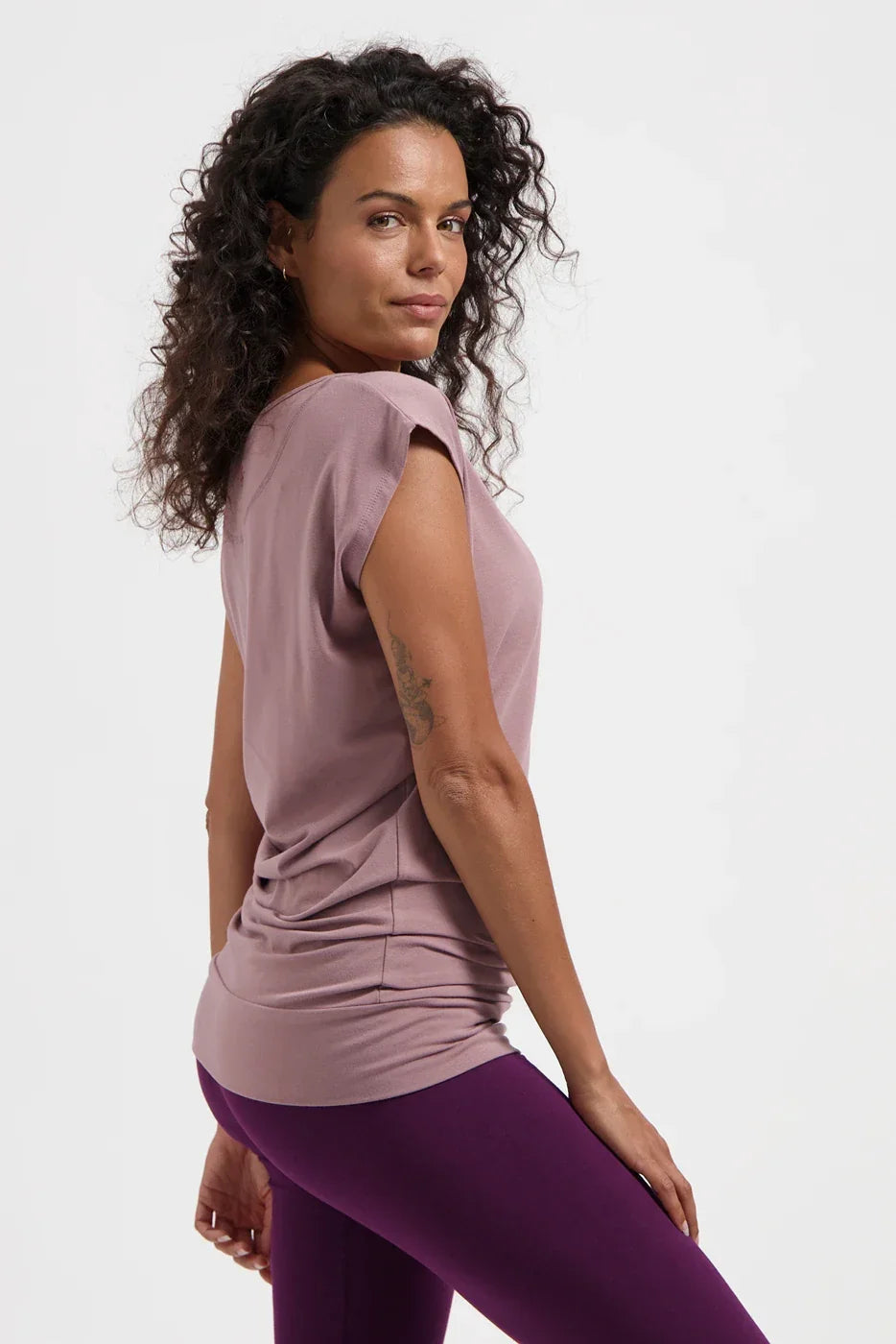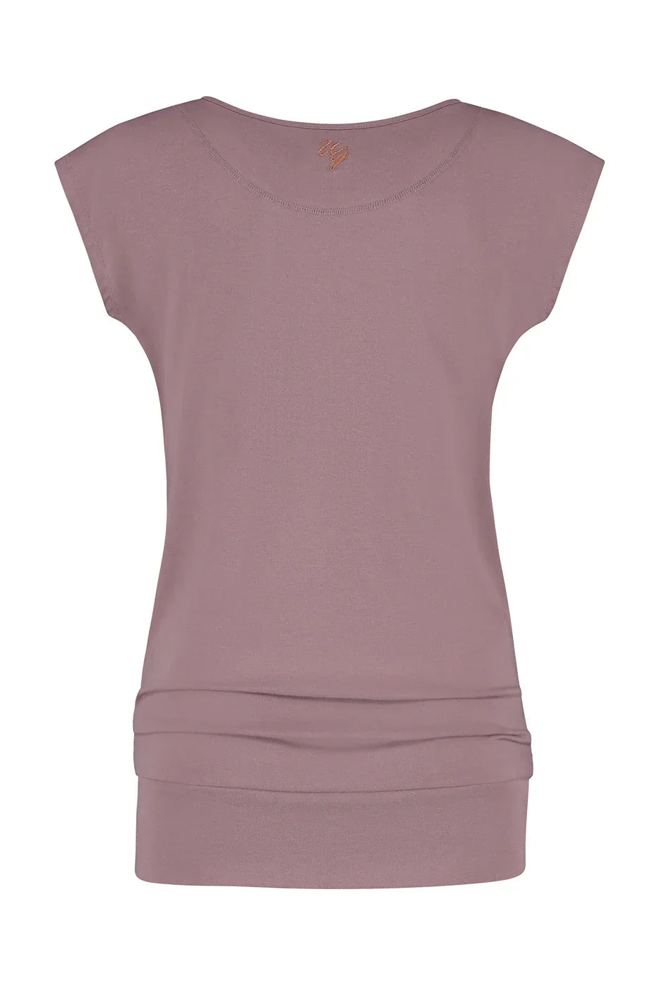 Het Asana shirt heeft een losse, luchtige pasvorm, maar dankzij de brede heupband blijft alles netjes op z’n plek. Zelfs bij twists blijft het shirt netjes zitten en blijven je buik en onderrug goed bedekt. De ronde halslijn geeft een vrouwelijke, ontspannen look. Perfect op de mat, maar ook om casual te dragen met een zachte legging of flowy pants.