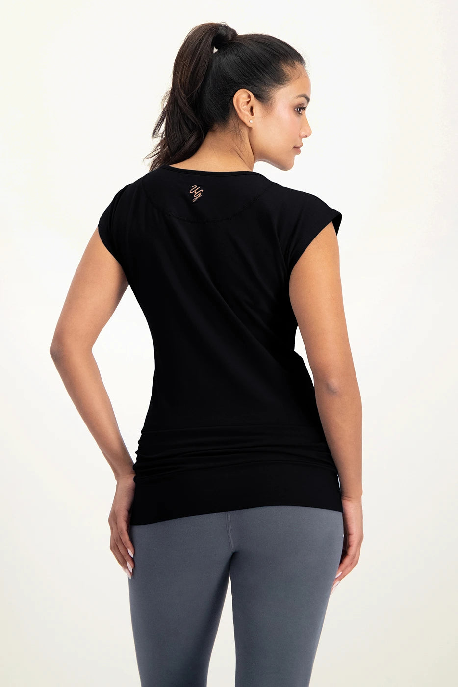 De Asana loose-fit yoga tee heeft een losse pasvorm, maar blijft goed zitten door de brede heupband. Deze band bedekt je buik en onderrug daarnaast goed. De dry-fit stof zorgt ervoor dat je langer fris en droog blijft tijdens je yoga practice en laat je huid goed ademen.