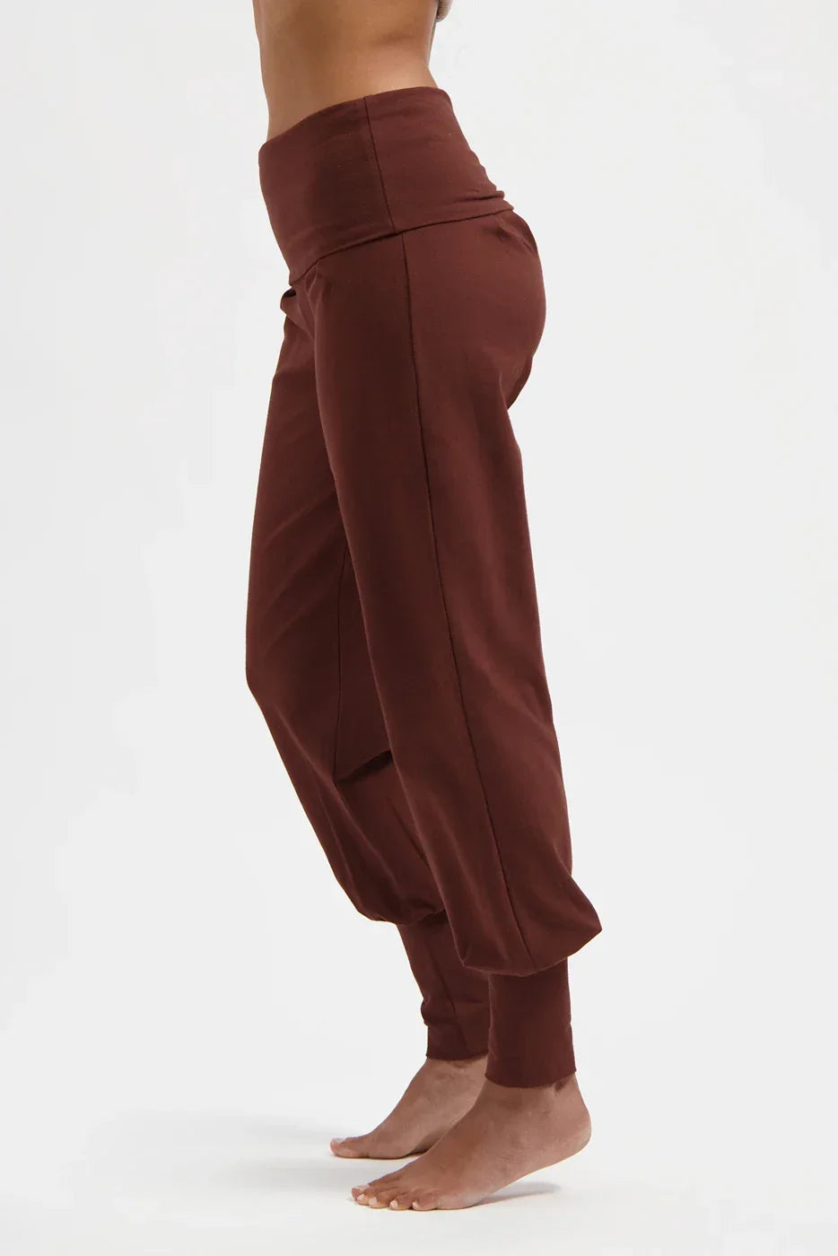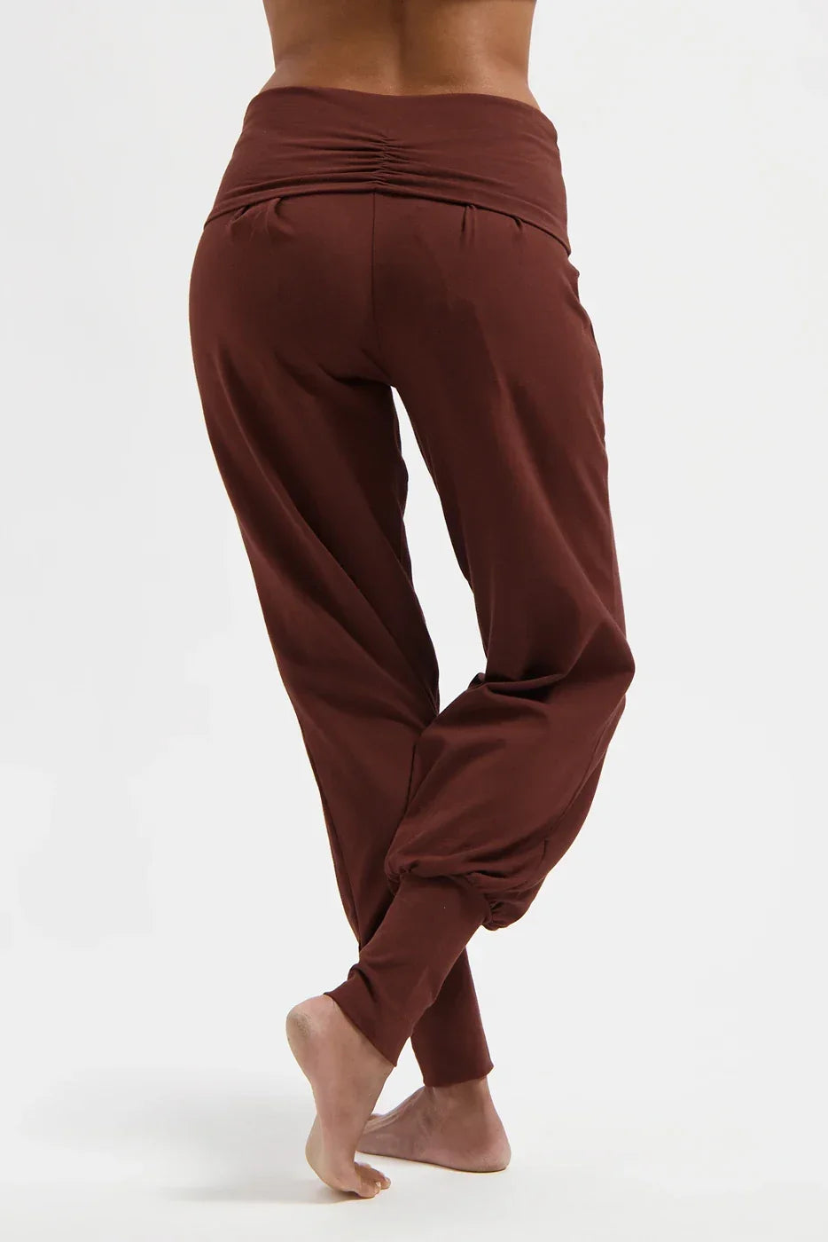 These airy women’s yoga pants are made from 100% certified organic cotton, offering a soft, breathable feel against your skin. The wide fold-over waistband keeps your lower back and belly comfortably covered—ideal for yoga, meditation, or a relaxing moment at home.