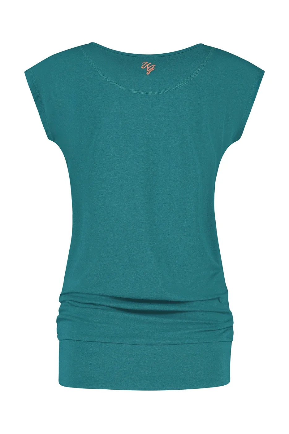 With its relaxed fit and wide waistband, this top stays comfortably in place—whether you’re stretching, twisting, or bending. It offers great coverage for your stomach and lower back. The round neckline and soft color give it a calm, stylish vibe. Perfect for your practice, but just as lovely to wear as an everyday casual tee.