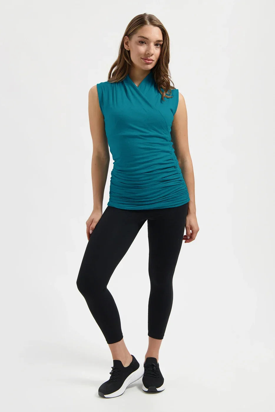 The Good Karma organic cotton yoga tank is a stylish and comfy yoga top for women that suits every yoga style. The double layer and soft pleats create a flattering silhouette, while the adjustable wrap neckline lets you wear it your way. Made from breathable organic cotton, this sustainable yoga top is a true essential for your yoga wardrobe.