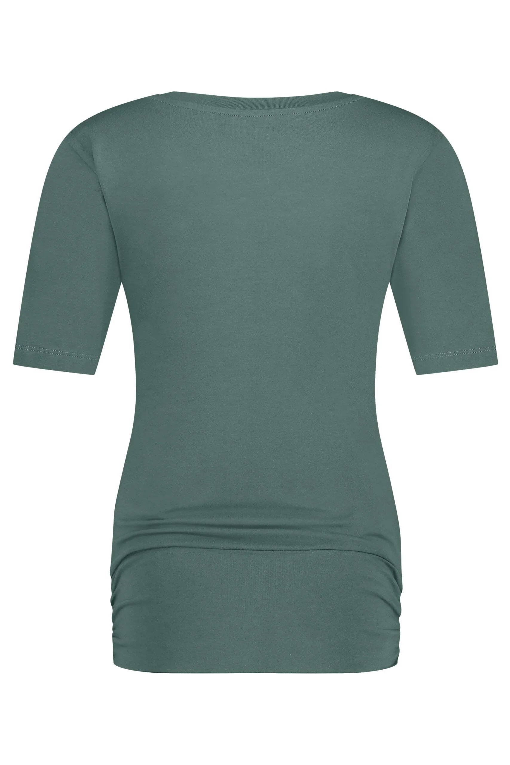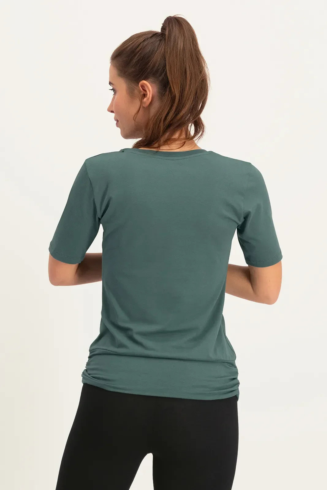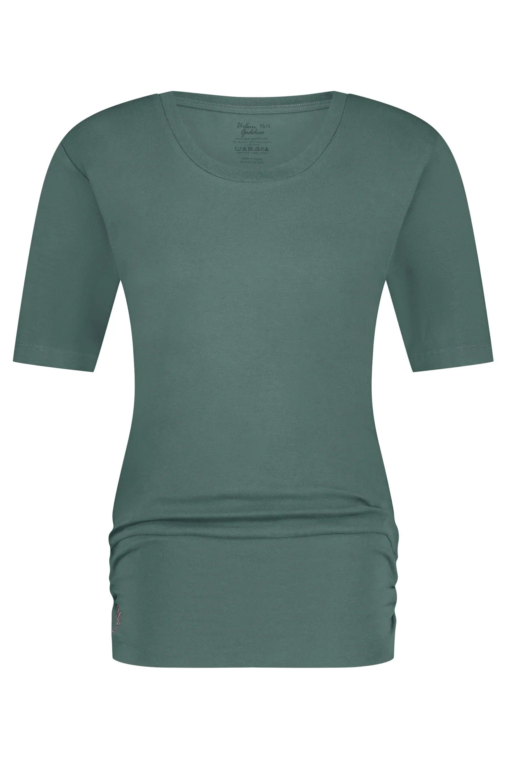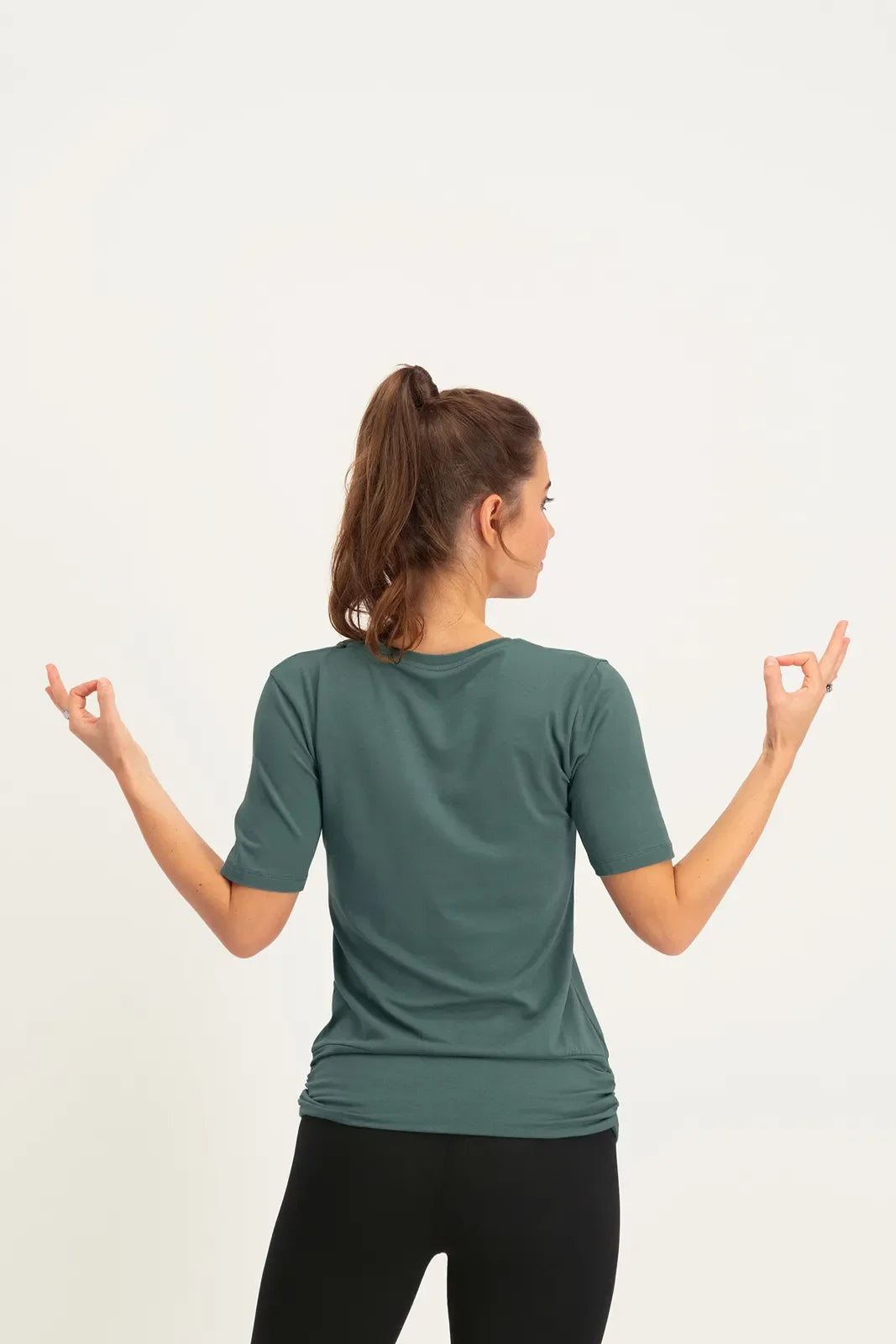 Do you love color? Then this comfortable yoga t-shirt in a beautiful green is a perfect match for you! Designed with a round neckline and sleeves that sit just above the elbow, this shirt ensures that your yoga outfit stays in place, even during intense power yoga sessions, thanks to its pleated waistband.