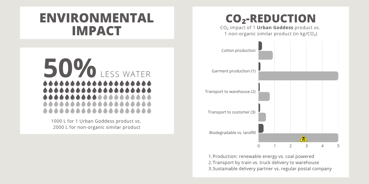 Wist je dat het maken van een Urban Goddess-item gemiddeld 1.000 liter water kost? Dat klinkt veel, maar is de helft van wat er nodig is voor een vergelijkbaar, niet-biologisch product.