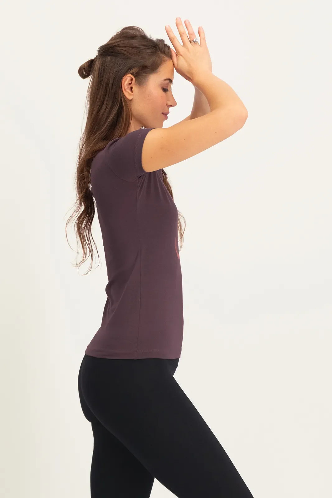Model Maat: Het model is 1,72 m en draagt de Om Core katoenen yoga tee in maat XS/S.